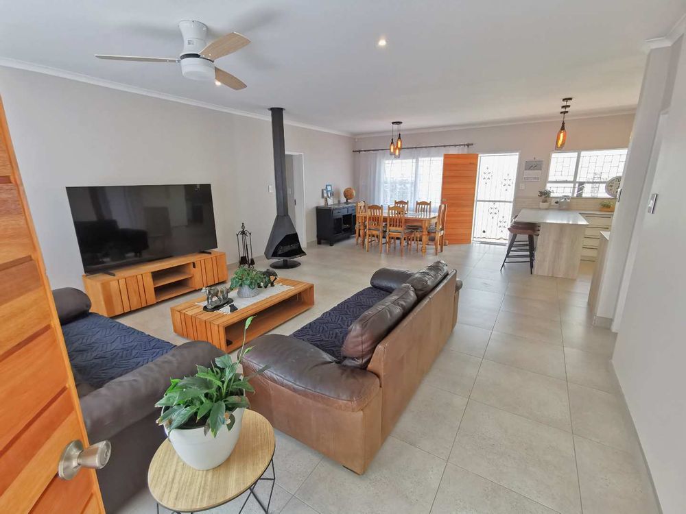 An open-plan kitchen and scullery with lounge, fire place and dining area